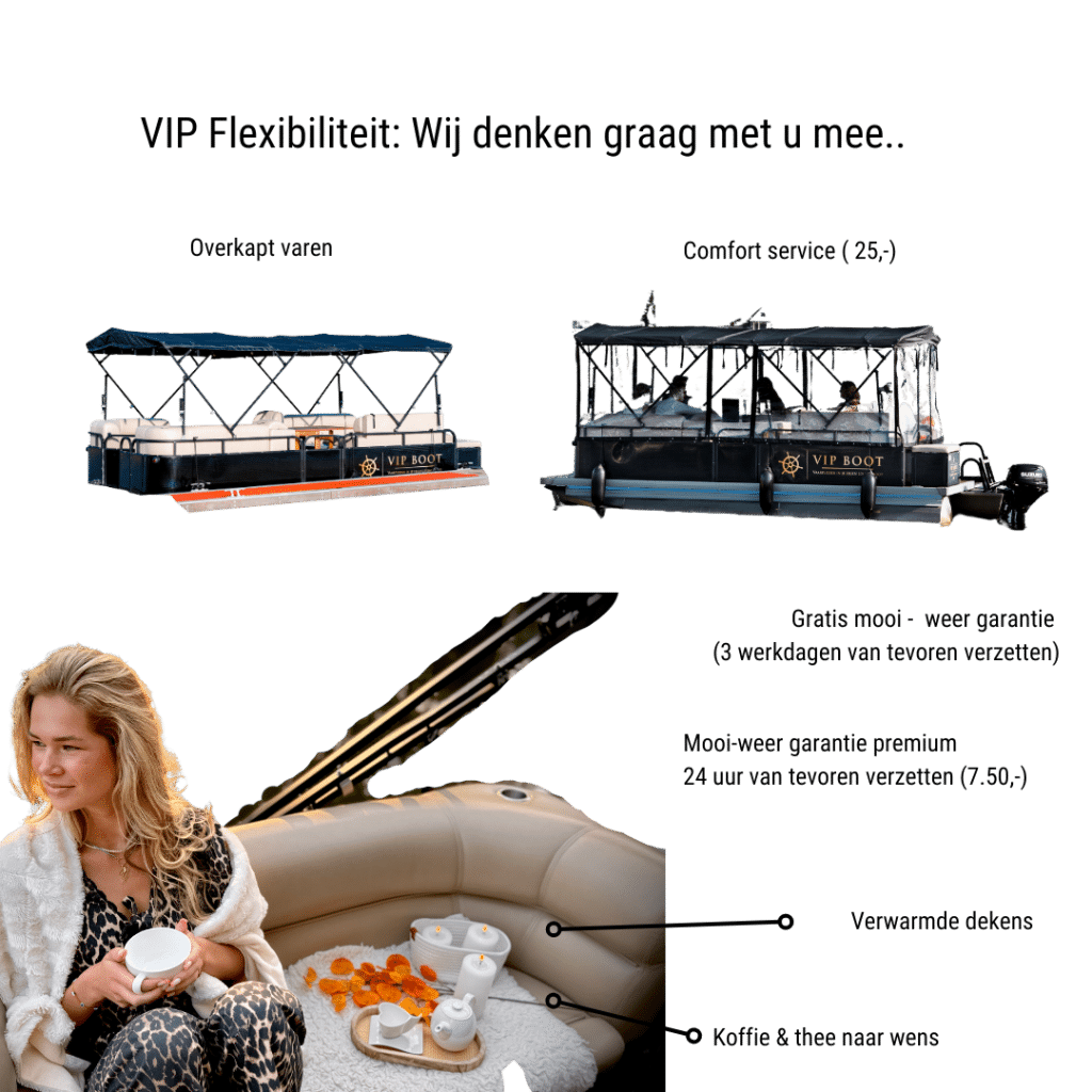 De boten kunnen worden overkapt in zijn geheel, vip boot 1 kan tot de helft worden overkapt zodat u droog zit. Met onze nieuwe "comfort" service heeft u ook de mogelijkheid om de boot in zijn geheel ook winddicht en regendicht te maken, dit kunt u aangeven tijdens het boeken bij vip boot 2, 3 en 4. U kunt op aanvraag ook warme dekens geleverd krijgen. Een uniek concept! Hierdoor zit u lekker warm en kunt u alsnog heerlijk varen. Wilt u gebruikmaken van deze service? Laat het ons dan minimaal 1 dag van tevoren weten zodat wij dit voor u kunnen regelen. De servicekosten voor het dichtmaken van de boten bedragen 25 euro.